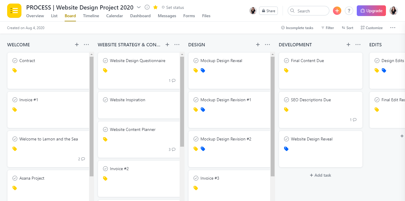 The project is set up as a Board (I like this better visually when walking clients through how to use Asana) and contains sections for on-boarding, website strategy & content, design, development, edits, launch, and off-boarding. Of course, they can change this view to anything they prefer.