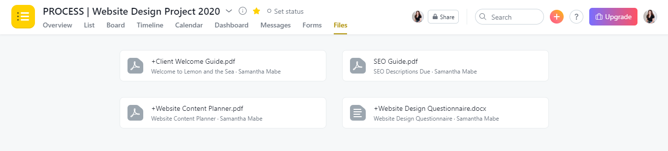 Each project has tabs for the different view options, as well as a dashboard to see goals and progress, messages, forms, and files. Any files added to tasks or comments within the project show up here so they’re all in one place.