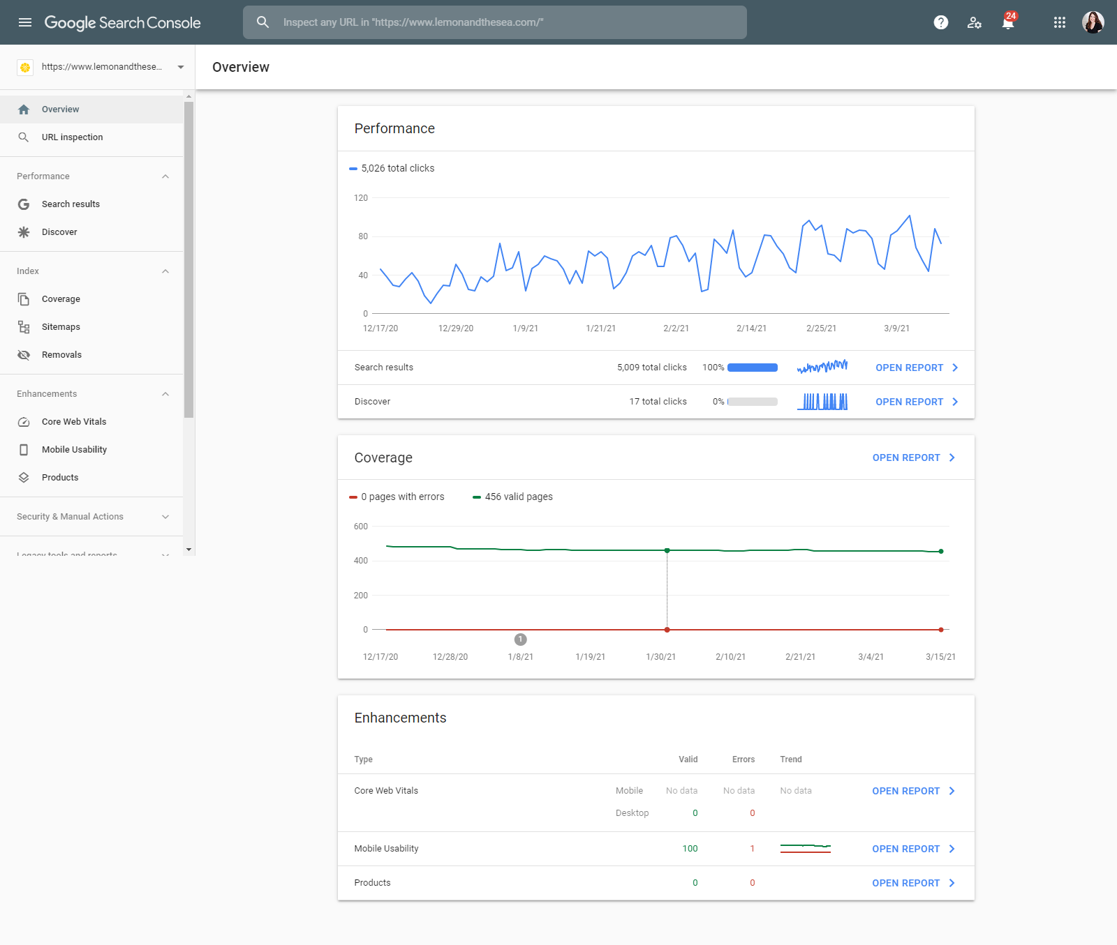 See your website’s performance in Search Console and check out your Core Web Vitals in the Enhancements section.