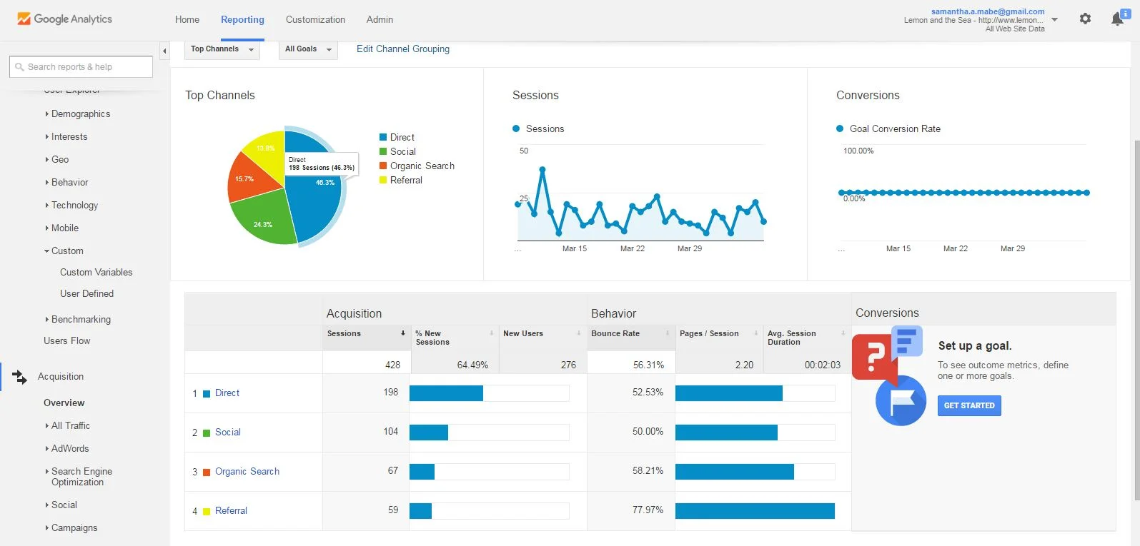 Out of the 428 sessions on my site, 198 came directly to my site, 104 came from social media, and 59 were referred from another website. These stats are pretty average for me, but I have noticed an increase in the amount of visitors coming from search engines.