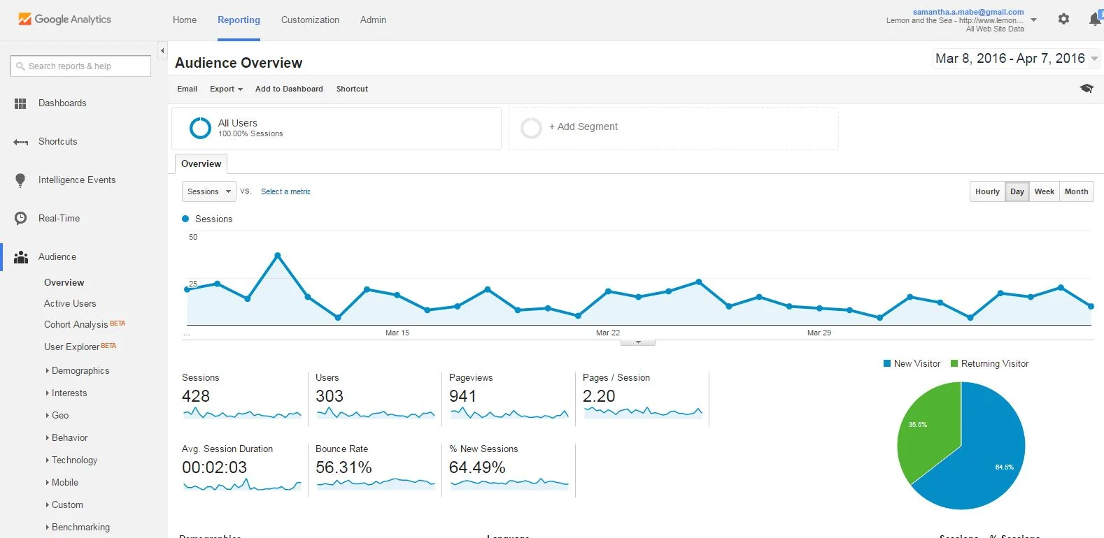According to Google Analytics, I had 941 pageviews this month (down by 28) and 303 visitors. The total bounce rate was 56% and 65% of my website visitors were new to Lemon and the Sea.