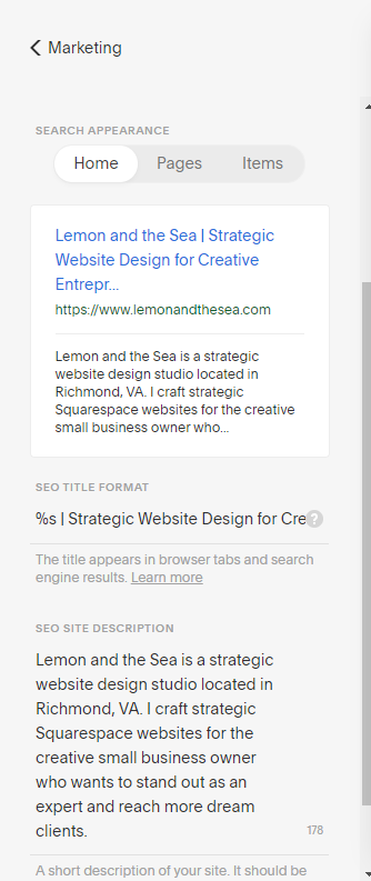 Next, let’s update your overall SEO settings. These are important because it’s the first thing that Google and other search engines will see and it’s the information that will be listed for your website’s Home page. You can find all of these settings under Marketing > SEO. You’ll want to update a few things: