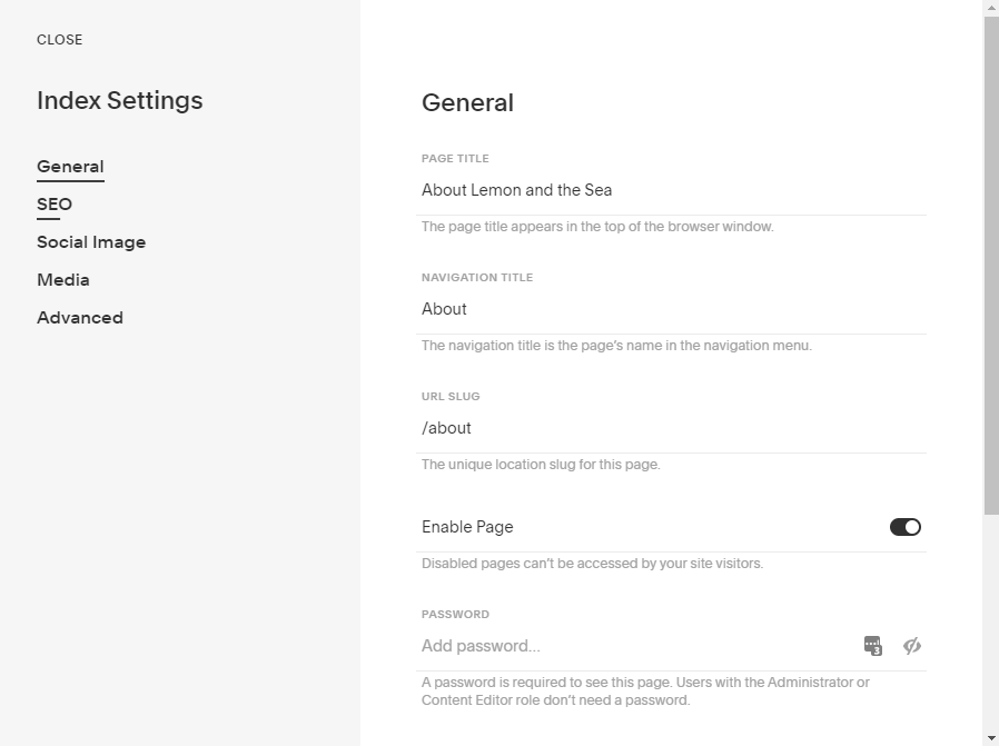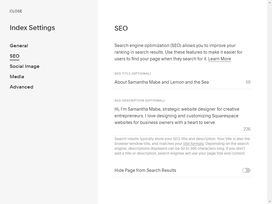 While the page that is set as your homepage will pull it’s SEO information from the main SEO settings, every other page on your website has individual SEO fields you can customize.