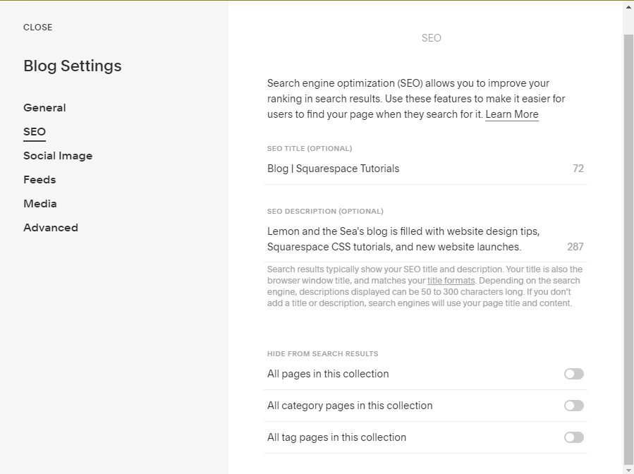 While you’ll update your Blog’s SEO title and description just like you do for other pages, there are a few more options available.