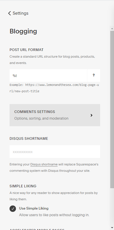 Post URL Format can be updated under Settings > Blogging. You’ll want to check this to see what the default post URL is and update if needed. Generally, Squarespace automatically includes a blog post’s date in the URL, but you’ll want to remove it. Since most of your posts will be relevant no matter when they’re viewed, the date could just confuse visitors and searchers.