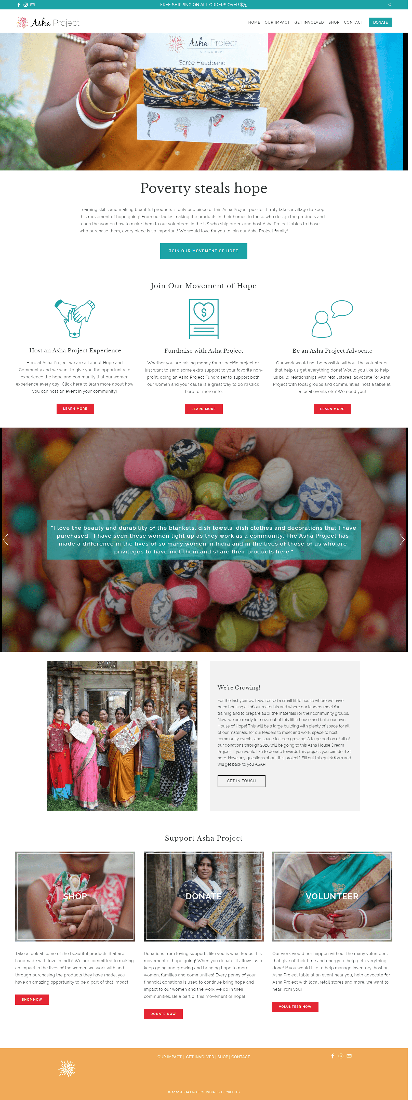 The Asha Project website was built on Squarespace, but didn’t show off their work or allow people to purchase products online. As the Project expands, they needed the ability to offer product sales throughout the United States instead of only in areas local to volunteers.