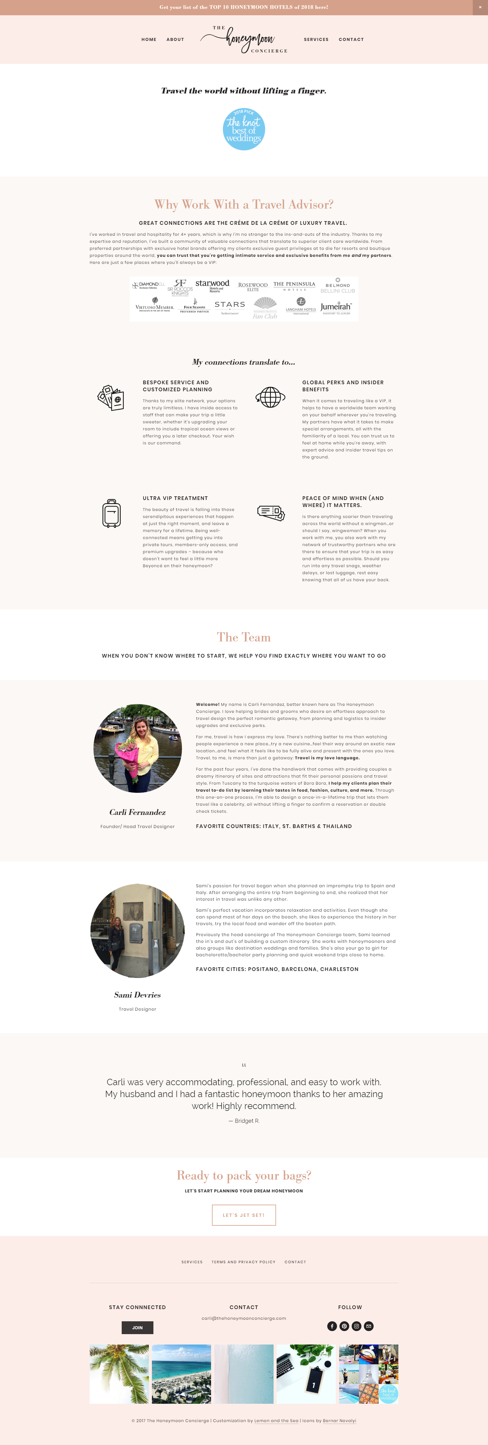Carli no longer has website shame and is getting more inquiries from her dream clients, as well as more email subscribers. We launched during her biggest booking season of the year, so she was able to take advantage of her refreshed website right away. She has also spent time traveling to new locations in order to find the best honeymoon spots for her guests while her business runs in the background.