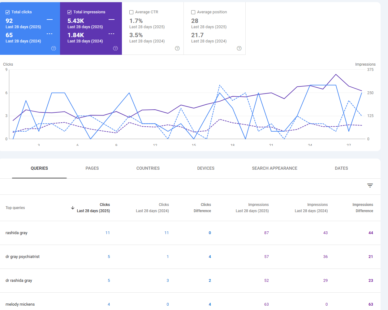 Dr. Gray’s original SEO performance was limited and heavily focused on her name. Our goal was to keep that strength—but expand it to broader, location-based and service-specific search terms.