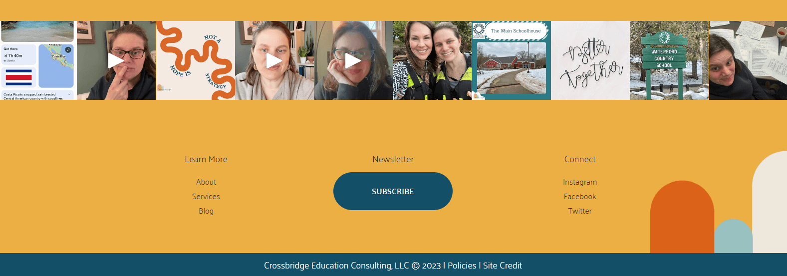 3 columns: learn more (about, services, blog), newsletter opt-in, and connect (social links) with the Instagram feed above