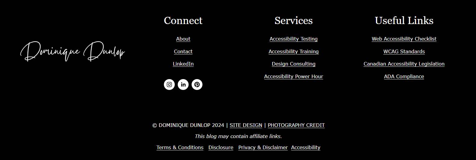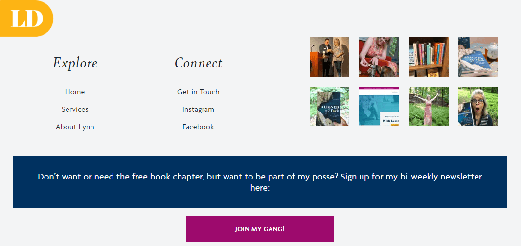 When you have a website with only a few pages, your footer design will be 3-4 columns across with a few links in each. Even in the simplest design, you should include elements that reflect your brand, such as your logo or a graphic. You can also include your Instagram feed if you update it regularly and want to grow your following.