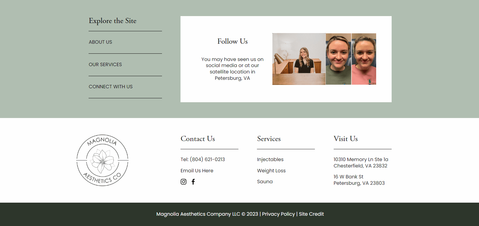 2 sections: main links and Instagram feed and a 4 column layout below with logo, contact info, service links, and locations.