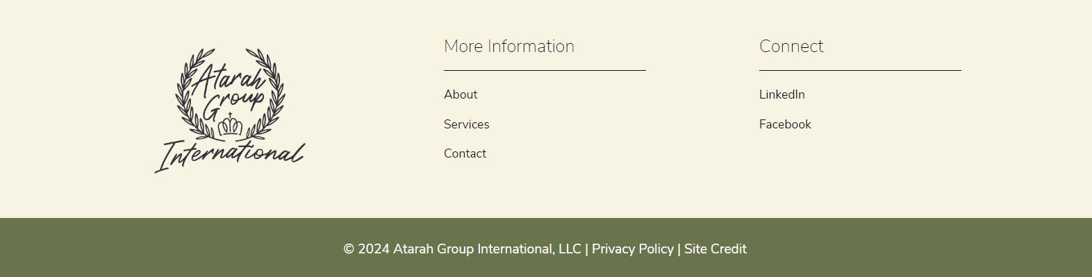 3 columns: logo, more information (about, services, contact), and connect (social links)