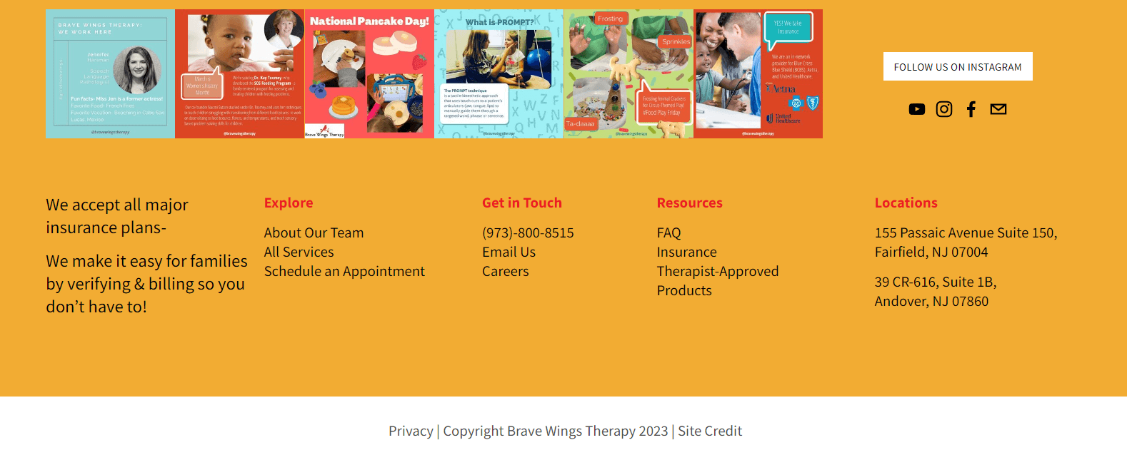 5 columns: insurance information or logo, explore (about, services, appointment), contact (phone, email), resources (FAQs, insurance) and locations with Instagram feed above