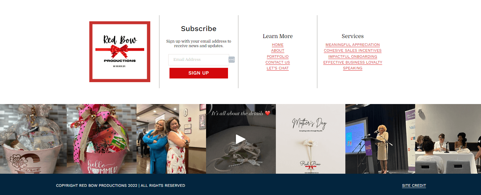 4 columns: logo, newsletter opt-in, learn more (home, about, portfoli9o, contact, consultation), and services (with links to each service type) with the Instagram feed below.